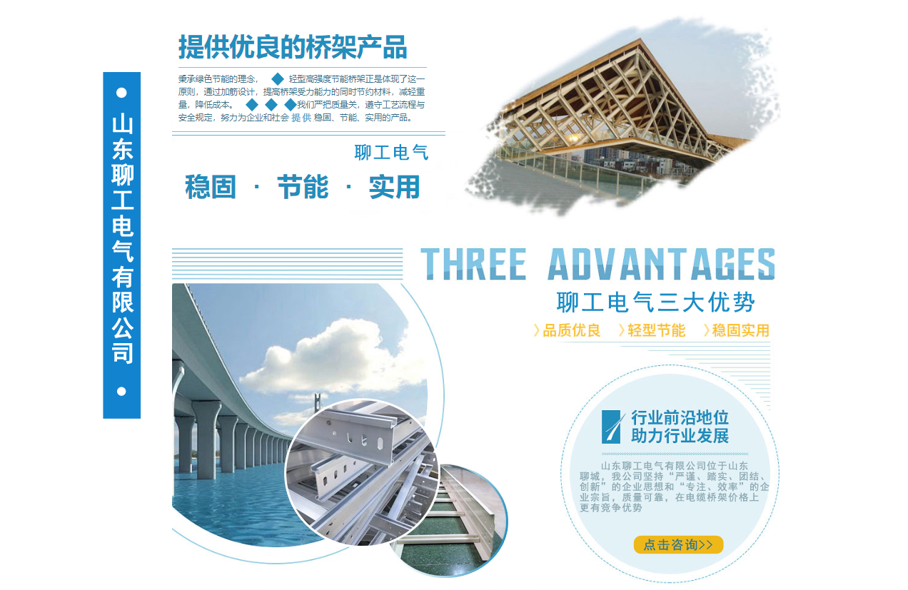 山東聊工電氣有限公司位于山東聊城,是一家銷售各類橋架的公司,公司主營鍍鋅防火噴塑橋架,鍍鋅防火電纜橋架 ,不銹鋼電纜橋架,熱浸鋅電纜橋架,鋁合金電纜橋架,熱鍍鋅電纜橋架,梯式電纜橋架等我公司堅持“嚴謹、踏實、團結、創(chuàng)新”的企業思想和“專注、效率”的企業宗旨,質量可靠,在電纜橋架價格上更有競爭優(yōu)勢。公司追求品質,配有研發(fā)人員,進行產品的改革和創(chuàng)新,服務先進走出了一條富有企業特色的可持續(xù)化發(fā)展之路! 我公司鄭重向你承諾:保證最好的質量,以低的價格,完善的售后服務,來答謝新老客戶。可提前電話聯系。...